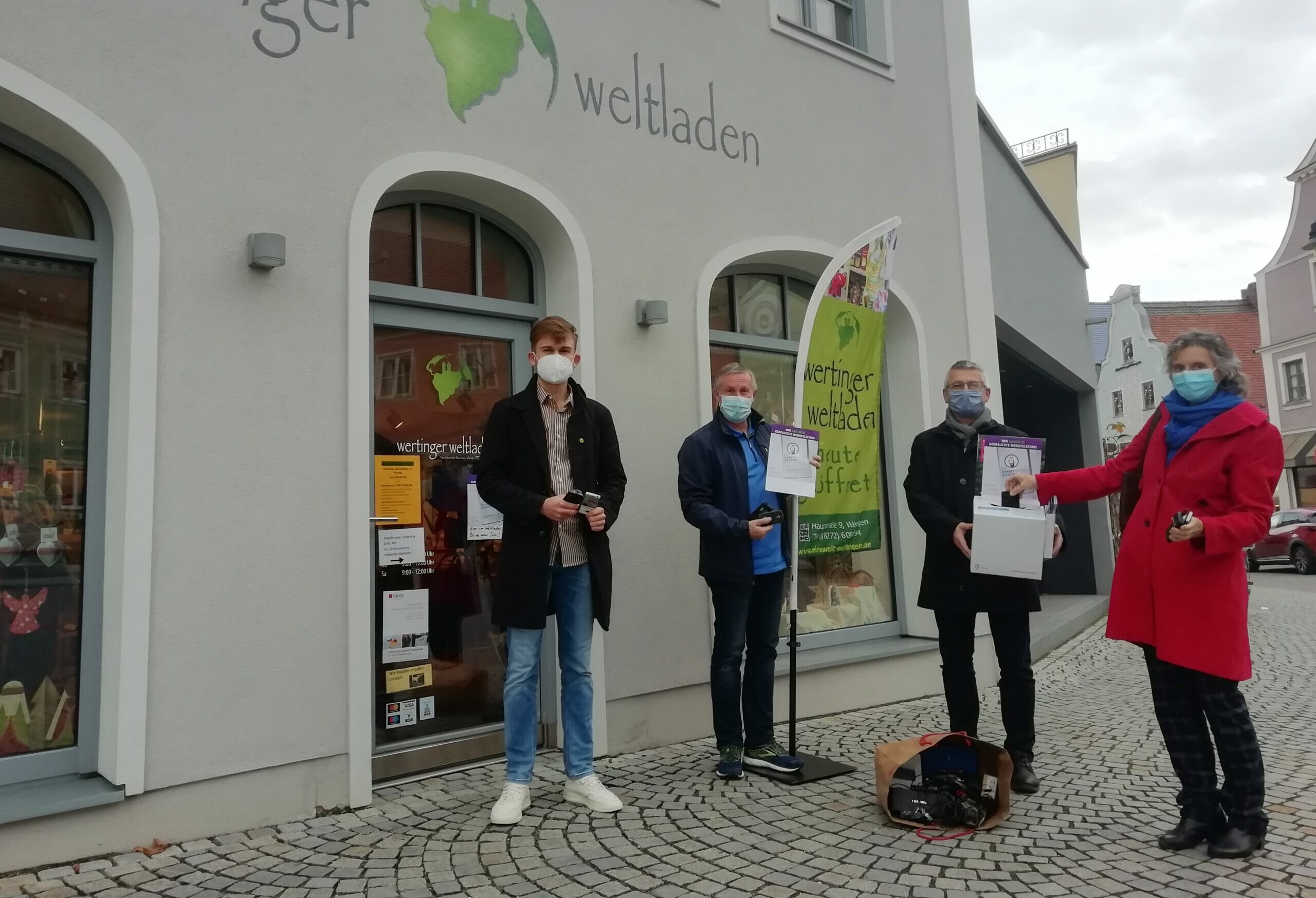 Der Kreisverband der Grünen unterstützte eine Aktion des Wertinger Vereins „Solidarität für Eine Welt“ und sammelte fast ein Jahr lang bei vielen Gelegenheiten gebrauchte Mobiltelefone ein. Jetzt, wenige Wochen vor Schluss der Handy-Aktion, übergaben die Kreisvorsitzenden das gesammelte Gut an Vereinsvorsitzenden Anton Stegmairund Eine-Welt-Mitglied Markus Eser. Vor dem Weltladen Wertingen, den der Verein betreibt, gab es ein corona-konformes, kurzes Zusammentreffen für die Übergabe. Es war die erste Begegnung der neuen Grünen-Kreisvorsitzenden Angela von Heyden mit den Vereinsvertretern. Kreisvorsitzender Niklas Zöschinger war den Wertingern schon bekannt durch seine Funktion bei fridays for future, noch nicht aber in seinem neuen Amt als Kreisvorsitzender der Grünen.