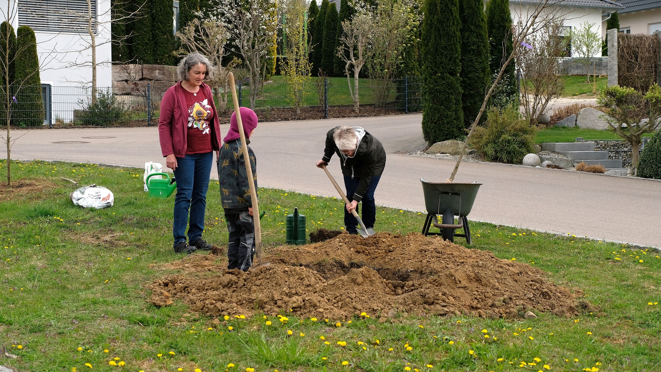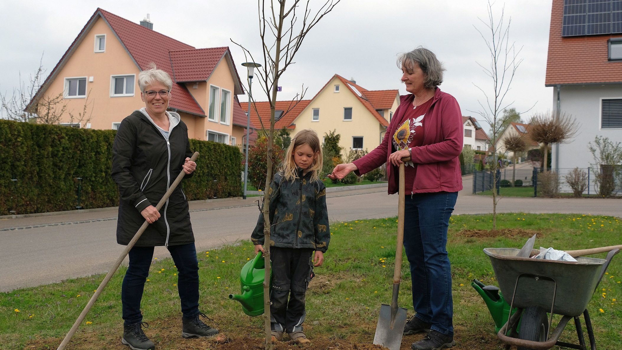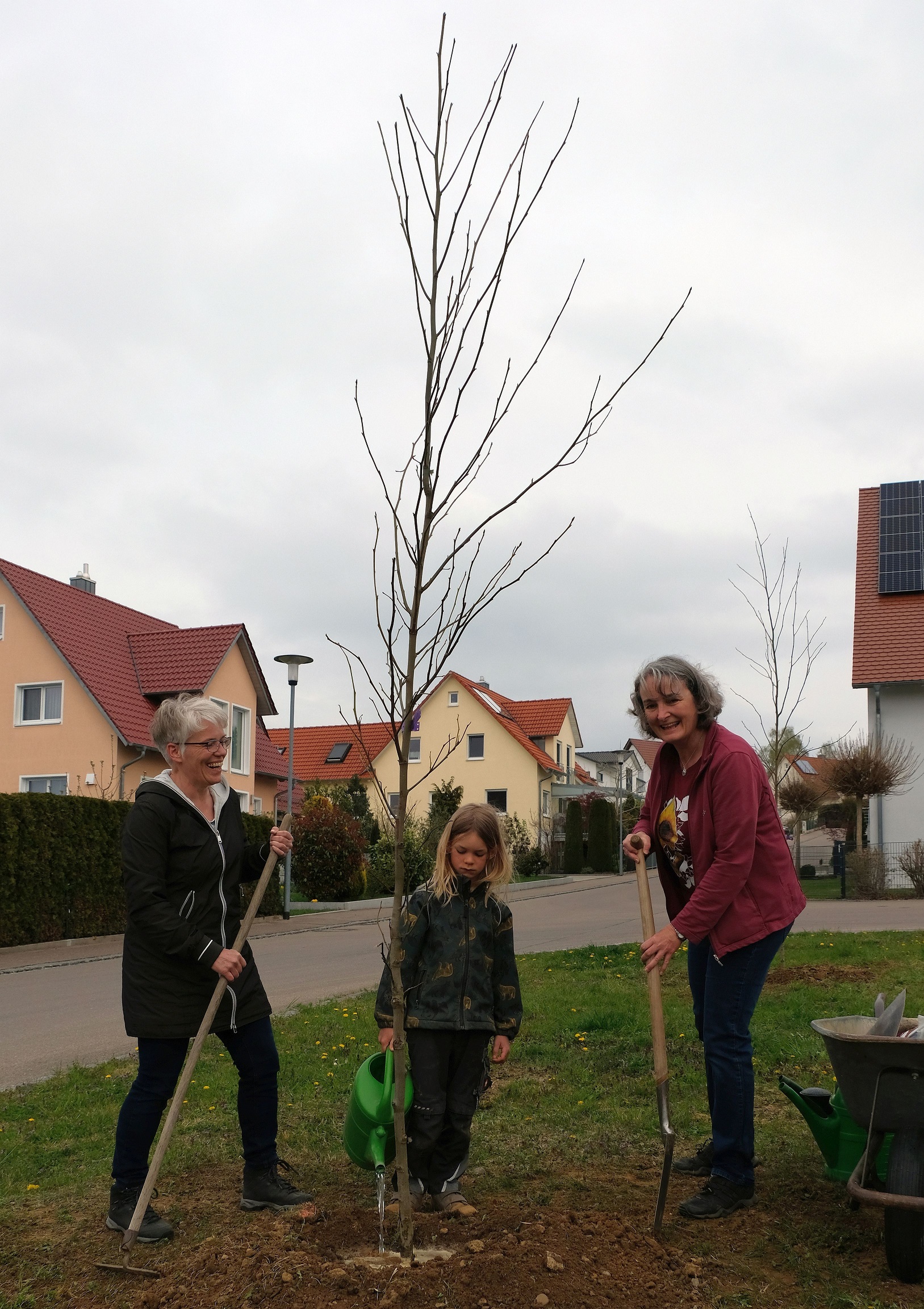 In Buttenwiesen haben die Mitglieder des Grünen Ortsverbands dafür die bisher unbepflanzten Verkehrsinsel im Stixenfeld ausgewählt. Mit Unterstützung der Kinder aus der Nachbarschaft pflanzten Franz Käsinger, Rita Demharter und Maria Hagl zwei Amberbäume und schufen damit quasi eine „grüne Insel“.